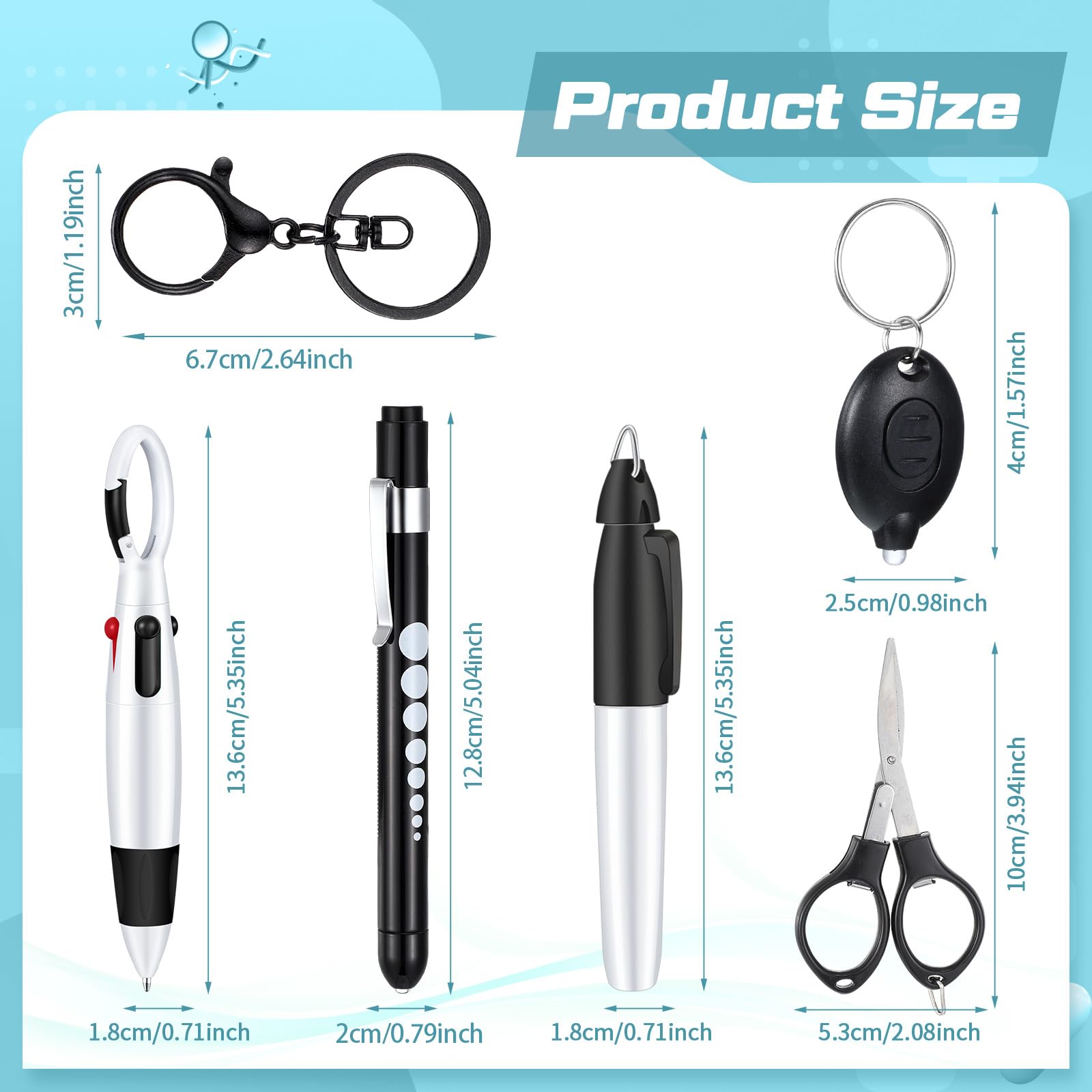 - Comprehensive Package: this nurse pen set includes 1 permanent marker pen, 1 pen light for nurses powered by 2 AAA batteries (batteries are not included), 1 extendable ballpoint pen, 1 keychain clip, 1 foldable scissors, and a LED flashlight keychain; This all inclusive package skillfully combines the tools most needed in any profession; The compact design aids with portability and precision, catering to diverse needs of any professional